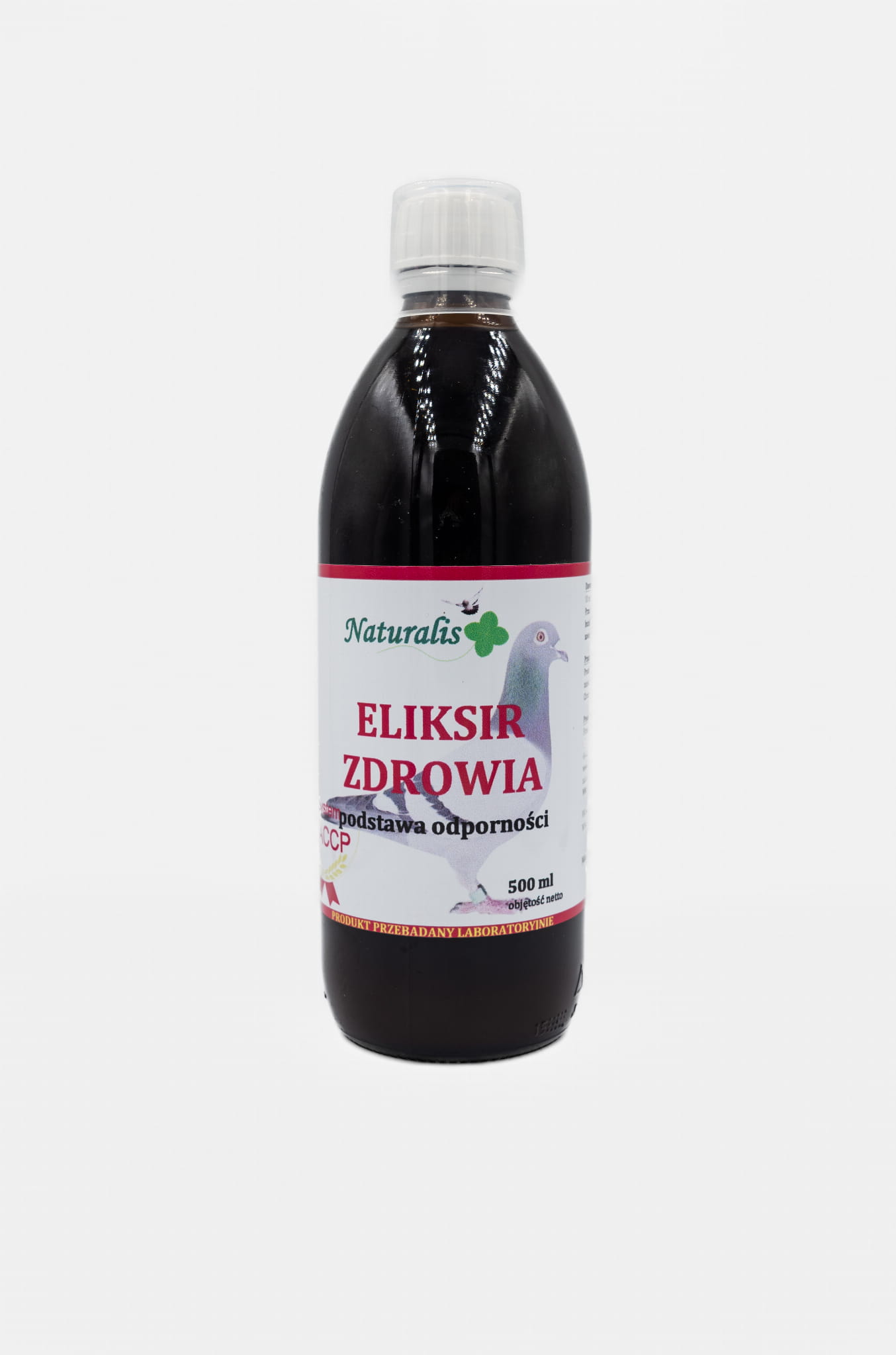 ELIKSIR ZDROWIA to w 100% naturalne, najwyższej jakości uzupełnienie diety gołębi pocztowych. ELIKSIR ZDROWIA działa fenomenalnie na układ oddechowy i trawienny, wspomaga system odpornościowy oraz zwiększa siłę, witalność oraz wytrzymałość. Przyspiesza regenerację organizmu po odbytych lotach i chorobach. Zawiera wiele substancji działających kompleksowo, między innymi: ekstrakty z czosnku, cebuli, marchwi, pietruszki, rzepy czarnej, selera korzeniowego, buraka i wielu innych warzyw oraz ziół. W skład ELIKSIRU ZDROWIA wchodzi również ocet jabłkowy z miodem i propolis w specjalnie dobranych proporcjach. Pełny skład preparatu jest zastrzeżony.