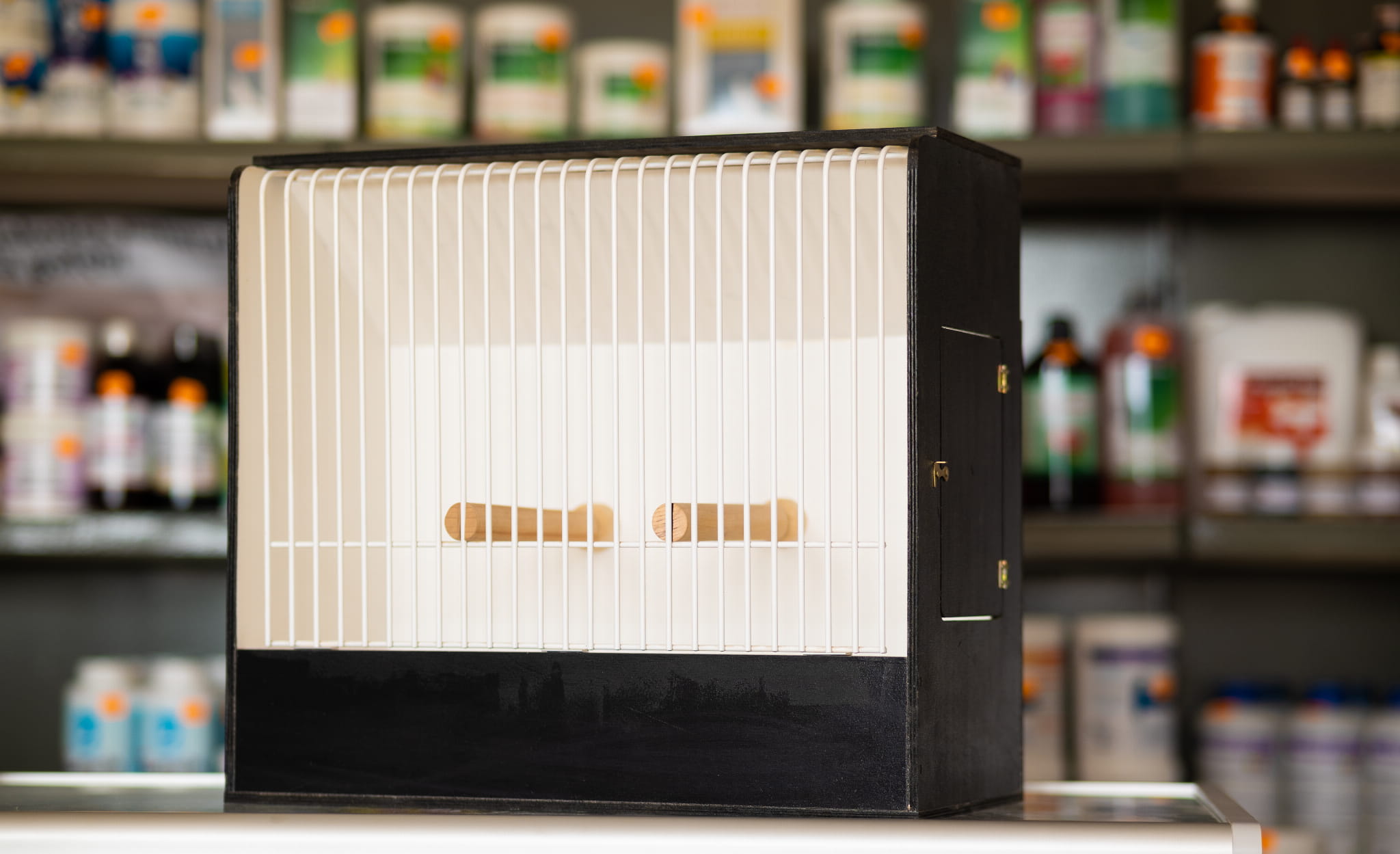 Klatka wykonana ze sklejki biła w środku. Front jest wykonany z pręcików metalowych. Posiada ona otwieranie z boku i 2 pręciki do siedzenia.